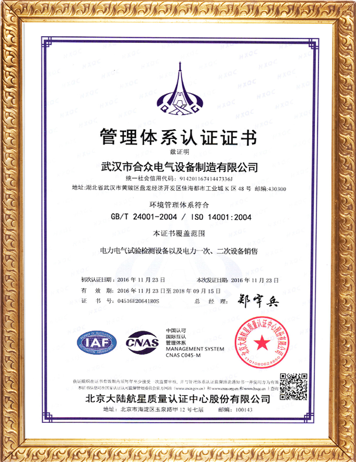 熱烈祝賀武漢市合眾電氣設(shè)備制造有限公司,職業(yè)健康安全管理體系符合GB/T 28001-2011/ OHSAS 18001:2007和環(huán)境管理體系符合GB/T 24001-2004/ ISO 14001:2004。
