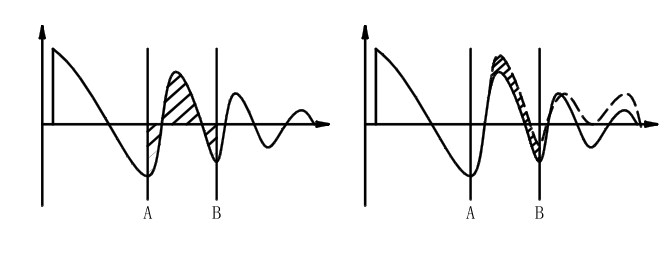 在任意指定的區(qū)間內(nèi),對標準線圈和被測線圈波形面積進行比較。如圖1-4-1所示,計算出A-B區(qū)間內(nèi)的面積(如圖中陰影部分),判定兩者面積相差的程度。即兩波形在A-B區(qū)間的面積相減后的絕對值與標準波形在A-B區(qū)間內(nèi)的面積相除;判定的標準用百分比(%)進行設(shè)定,計算結(jié)果在范圍內(nèi)的為合格品。