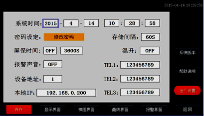 系統(tǒng)參數(shù)設(shè)置包括:日期、記錄間隔、密碼設(shè)定、網(wǎng)口通訊IP設(shè)定、蜂鳴器報警、溫升、屏保、設(shè)備地址。