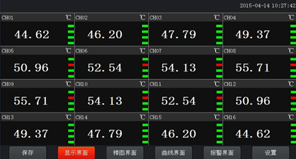 在界面底端有六個按鈕(保存、顯示、棒圖、曲線界面、報警界面、設(shè)置)。