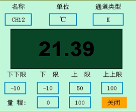 下圖為顯示畫面單個通道的具體內(nèi)容,其中包含通道名稱、單位、測量值和報警標志四個部分。報警標志從上到下依次為上上限報警、上限報警、下限報警、下下限報警。數(shù)值正常時,報警標志為綠色,當超過報警值時,對應(yīng)的報警標志會由綠色變?yōu)榧t色(或者是:出現(xiàn)報警時,對應(yīng)的報警標志會由綠色變?yōu)榧t色)報警值可以在參數(shù)設(shè)置里設(shè)置。