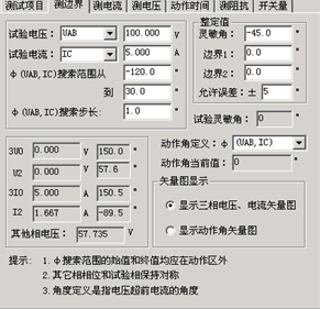 微機繼電保護測試儀的測邊界作者:合眾電氣發布時間:2021-08-16瀏覽量:3965 次字體顯示:【大】【中】【小】 微機繼電保護測試儀的測邊界。 測邊界 自動測試出方向性保護的兩個動作邊界,并且自動計算出最大靈敏角。在“顯示動作角矢量圖”的顯示方式下,從主界面右側的圖中可以很直觀地觀察到兩條邊界線和最大靈敏線。上一篇: 微機繼電保護測試儀試驗參量下一篇: 微機繼電保護測試儀測試項目的界面說明